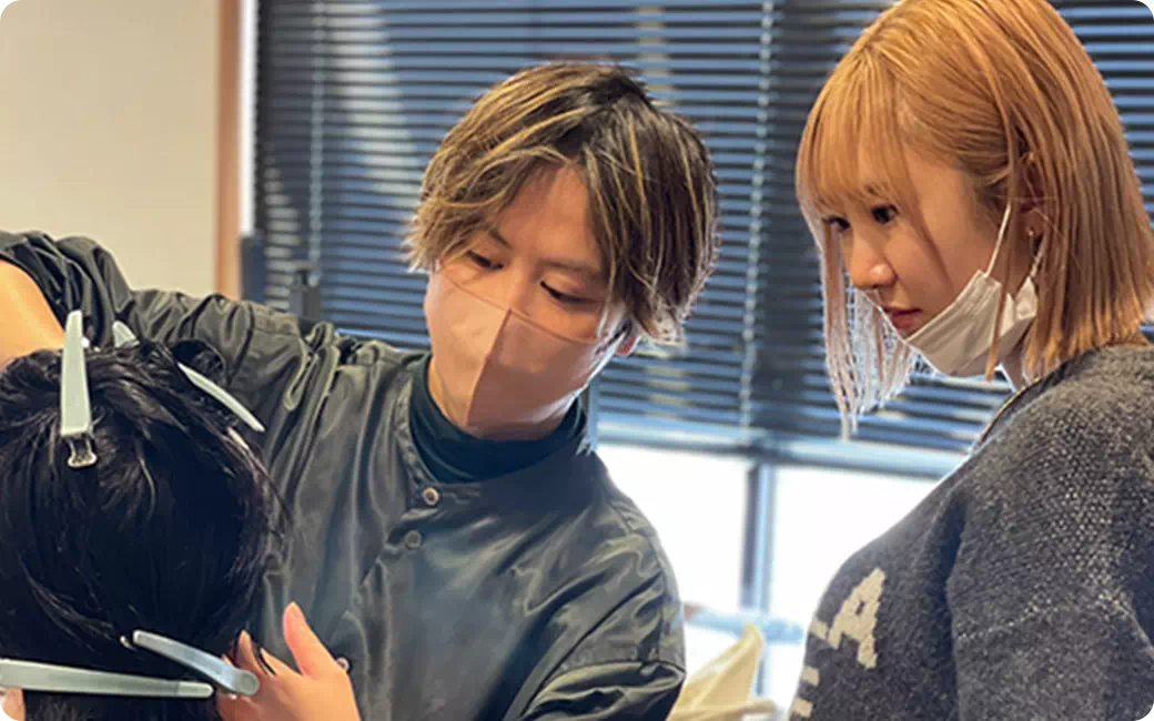 1年目・2年目・3年目など「年代」別の合同練習とシャンプー・カラー・カットなど「技術」別の合同練習を行なっています。仲間と切磋琢磨しながらレベルに合わせた学びや技術に特化した学びを得られます。